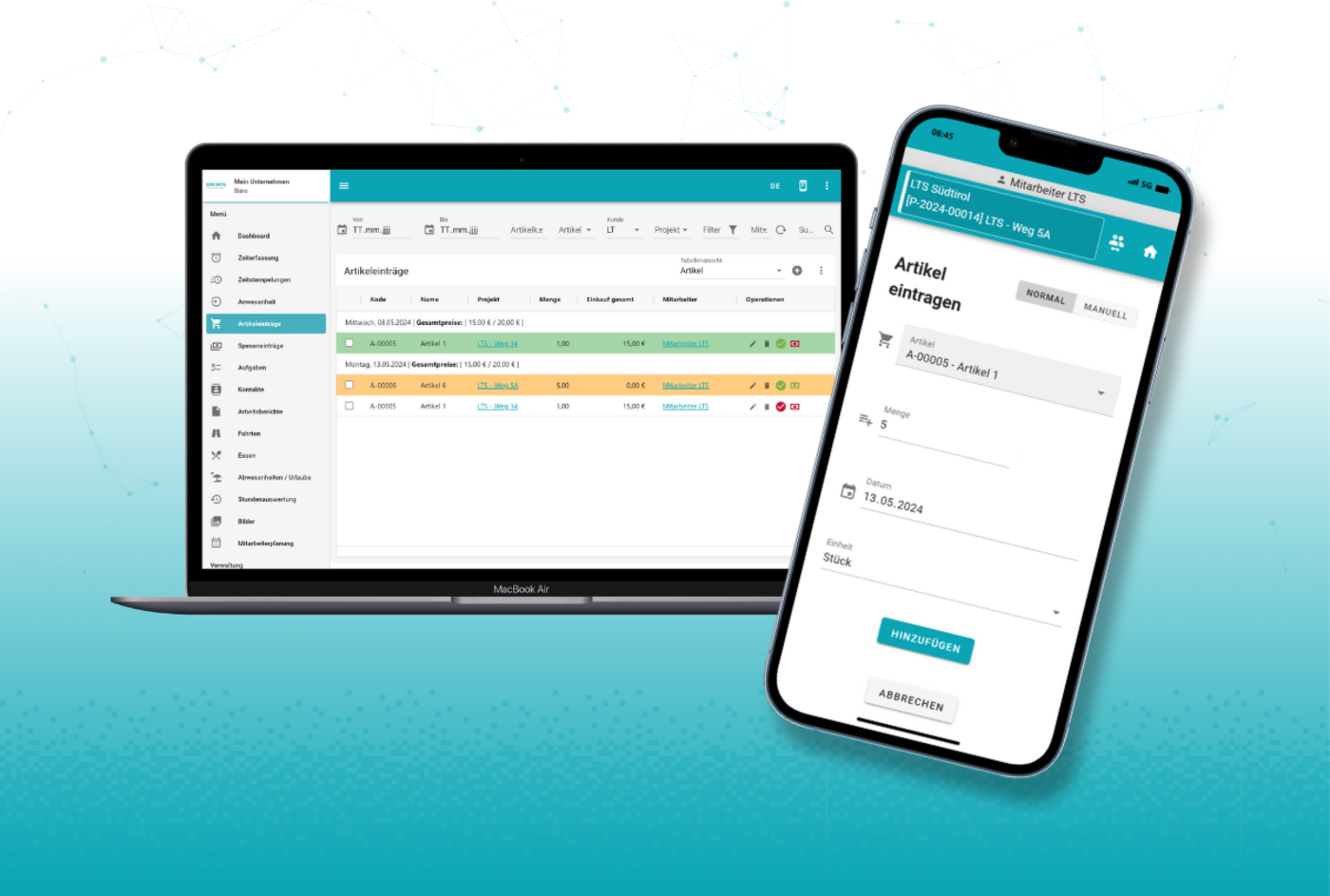 Entweder wählen Sie den verwendeten Artikel über eine Liste aus, welche im System hinterlegt wurde, oder der Artikel wird manuell eingetragen, sollte er noch nicht hinterlegt sein.