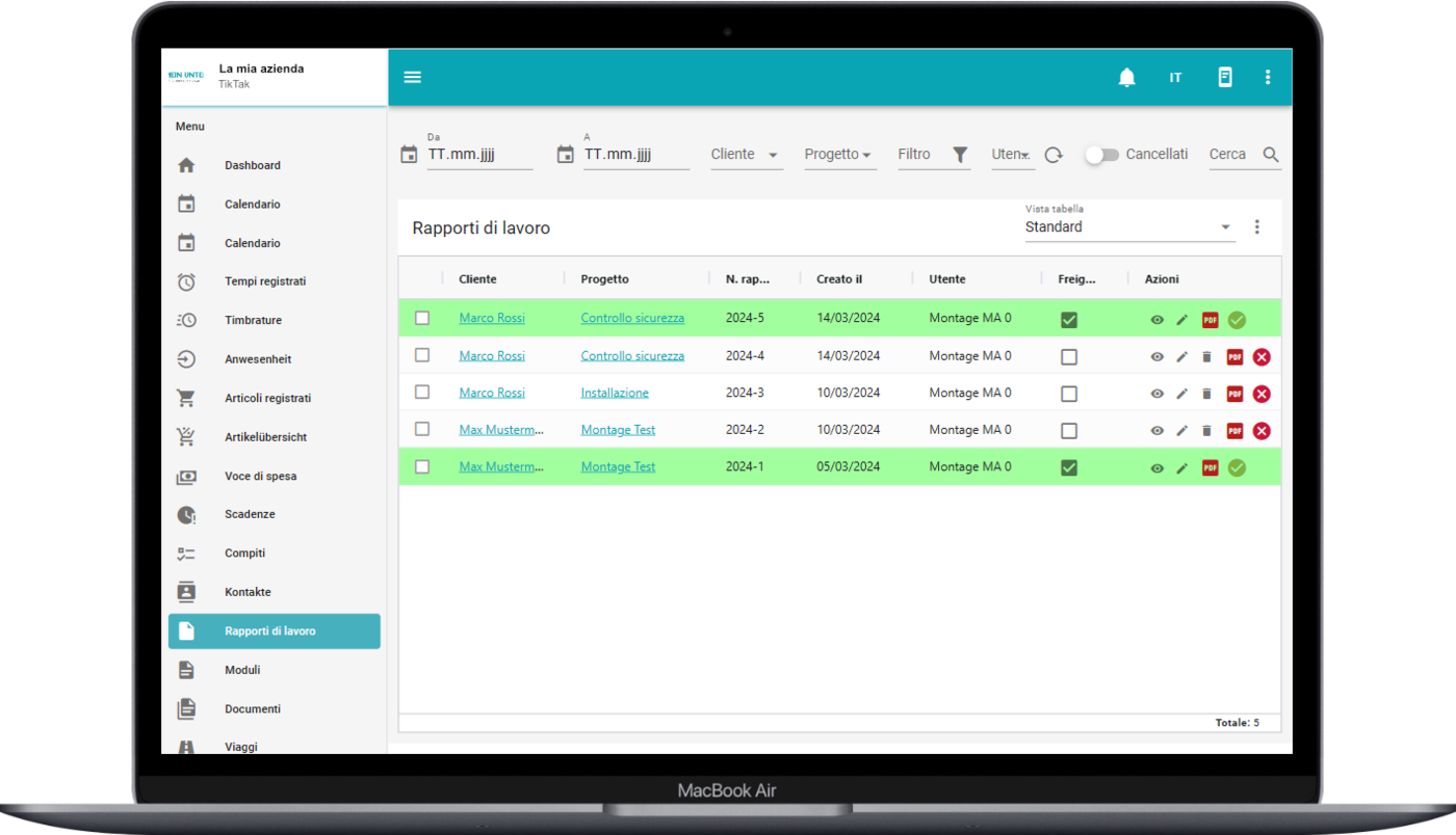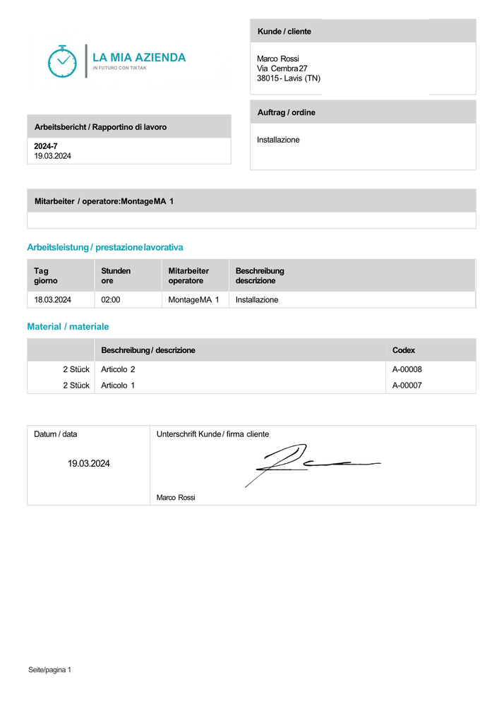 Con l'app TikTak, i vostri dipendenti potranno creare comodamente rapporti di lavoro tramite smartphone, tablet o PC, farli firmare e inviarli direttamente al cliente o al project manager via e-mail.