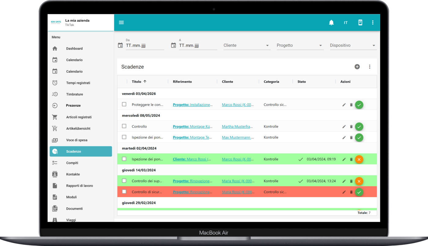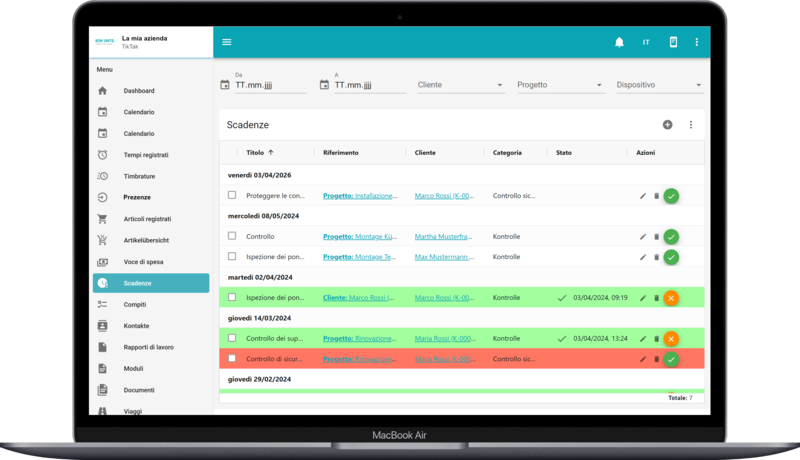 È possibile visualizzare le scadenze impostate sia nel backend che direttamente sui progetti o sui dispositivi.