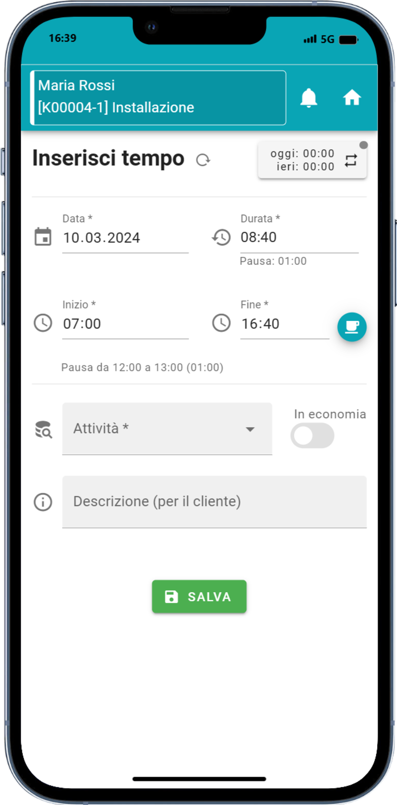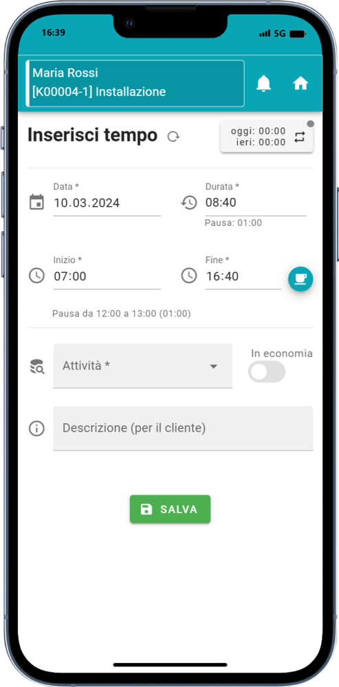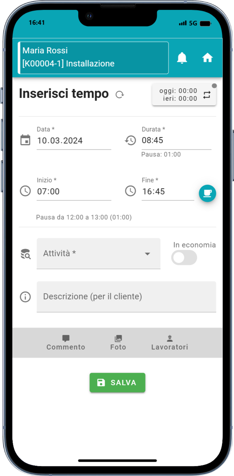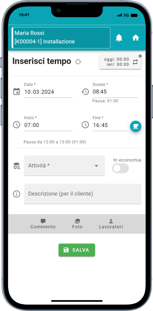 - funzione start-stop - Le ore lavorate vengono rilevate in automatico, con contestuale geolocalizzazione