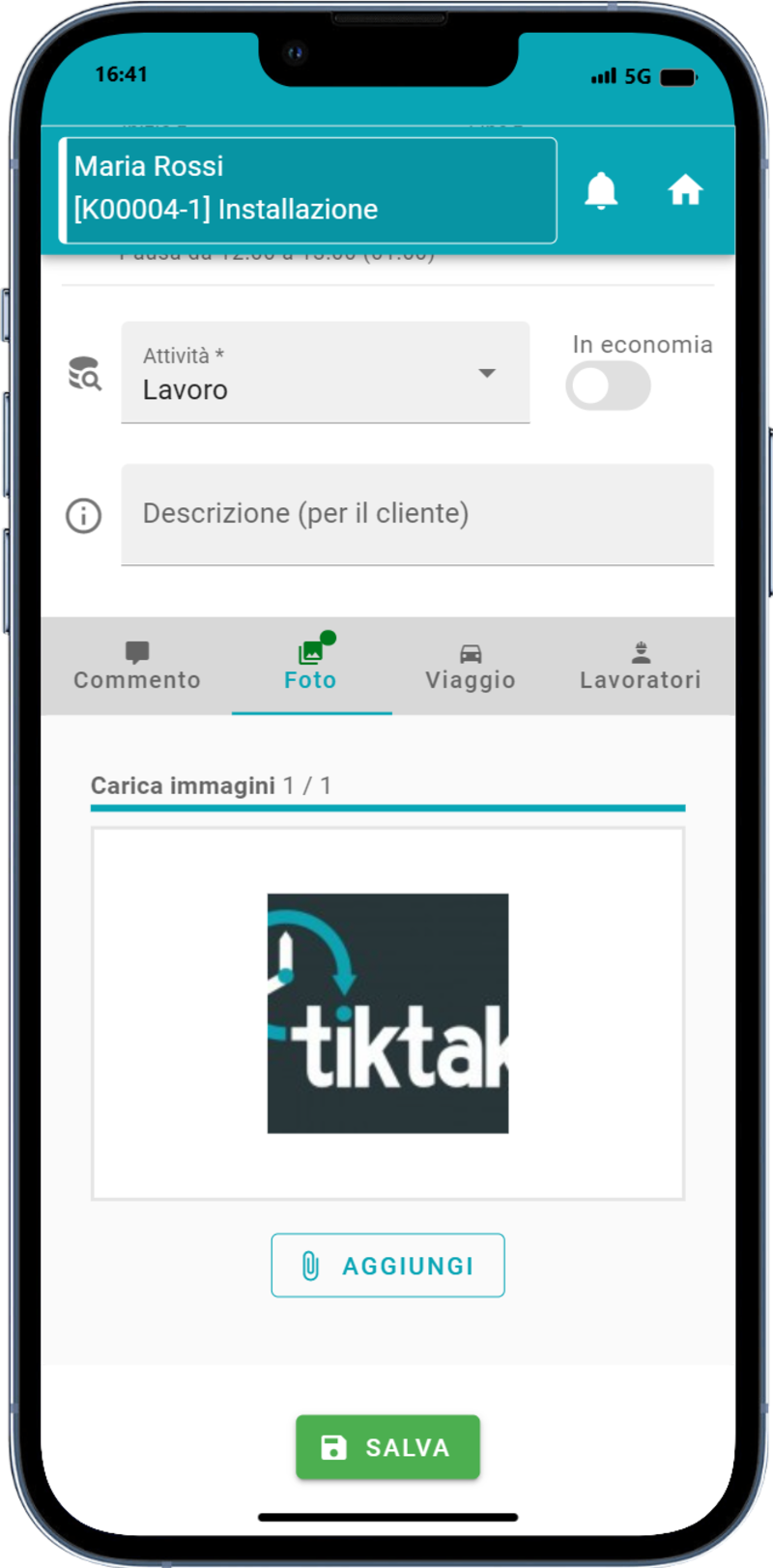 È possibile aggiungere immagini direttamente ai tempi registrati, associandole poi al cliente, al progetto e alla registrazione stessa - Per caricare le immagini, date un'occhiata al modulo Foto.