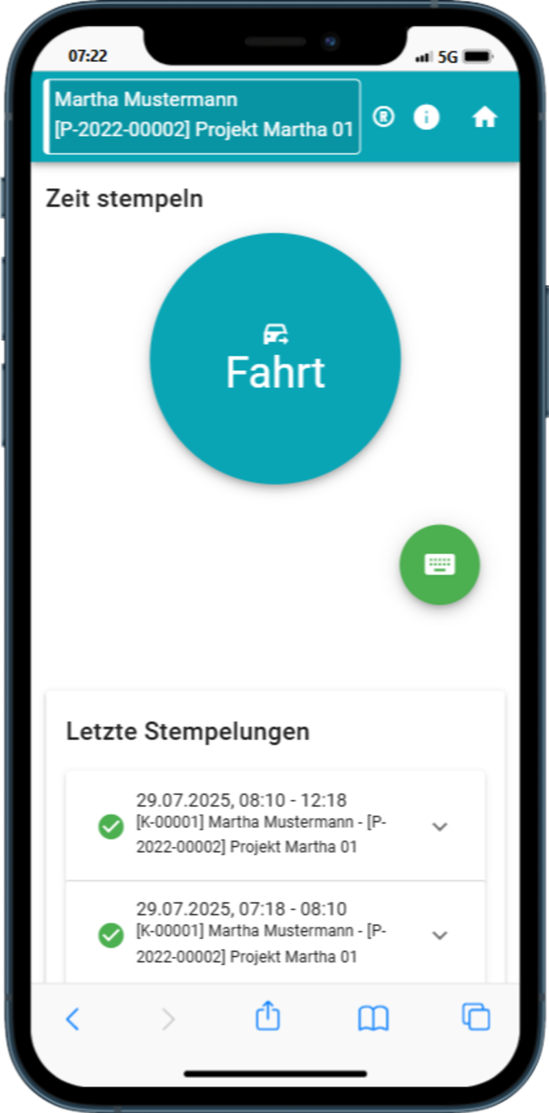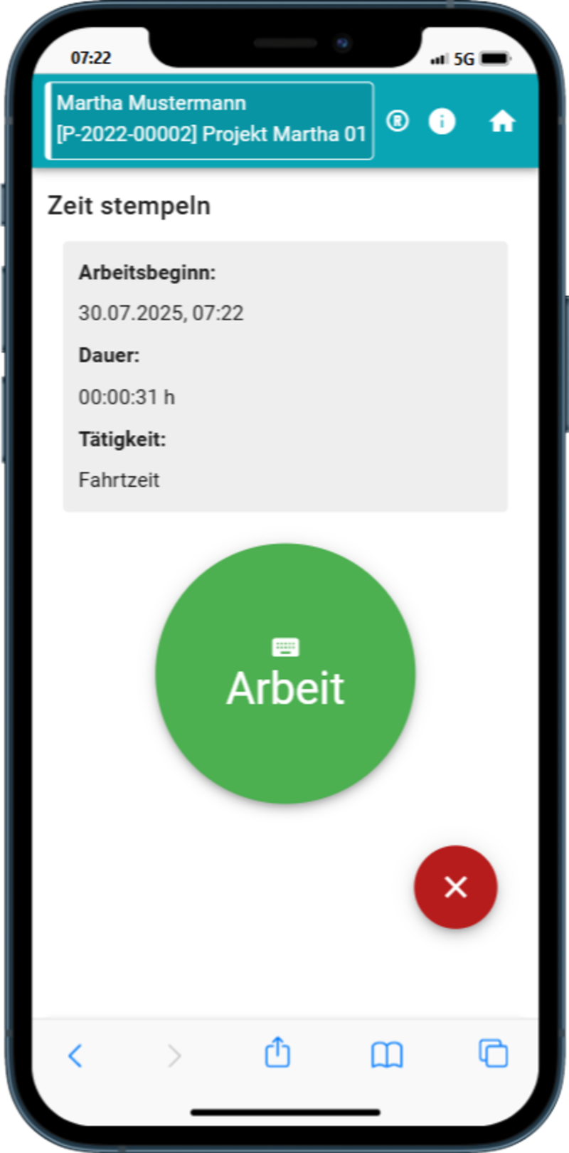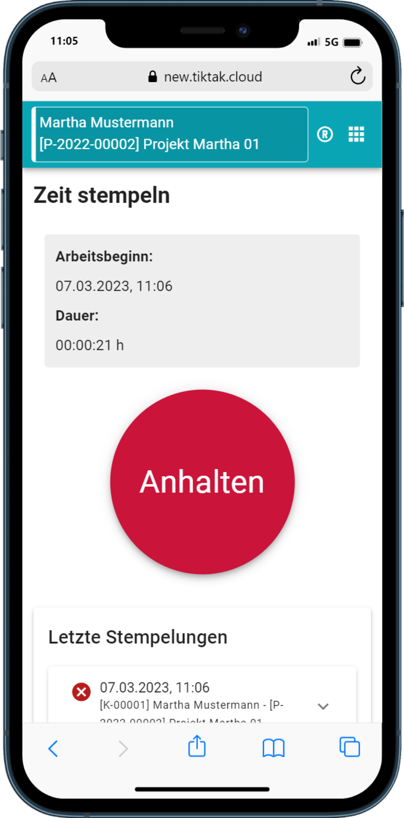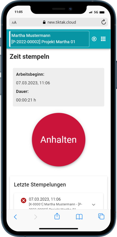Wählen Sie einen Kunde / ein Projekt aus und Starten Sie die Stempelung.