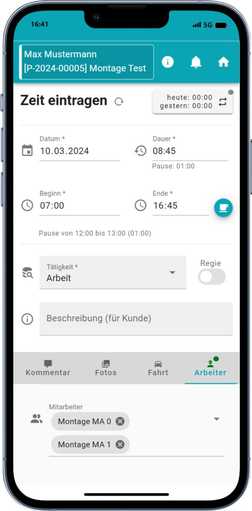 Sie waren zu zweit im Einsatz? Tragen Sie die Stunden für Ihren Kollegen gleich mit ein.