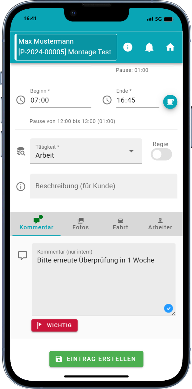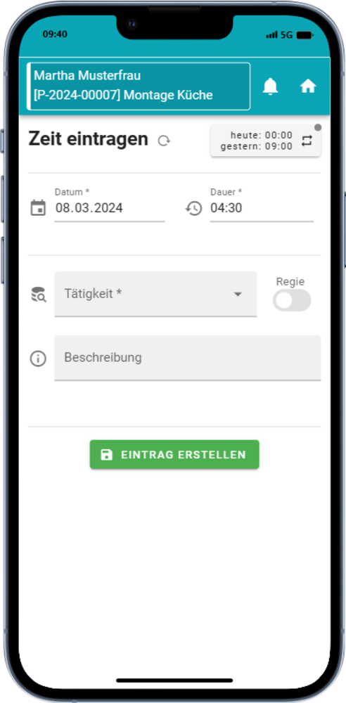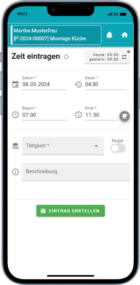 Der Mitarbeiter kann Stunden auch direkt als Regie eintragen, damit diese im Anschluss in der Abrechnung berücksichtigt oder auf einem Arbeitsbericht angeführt werden.