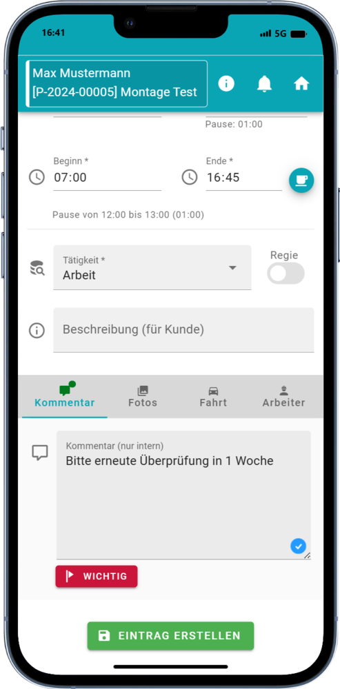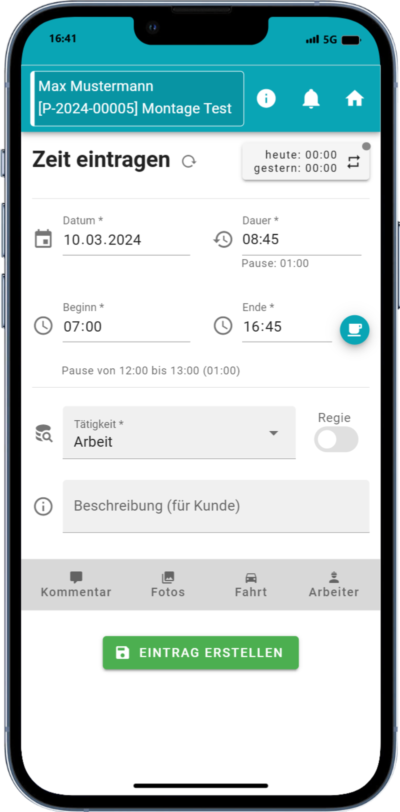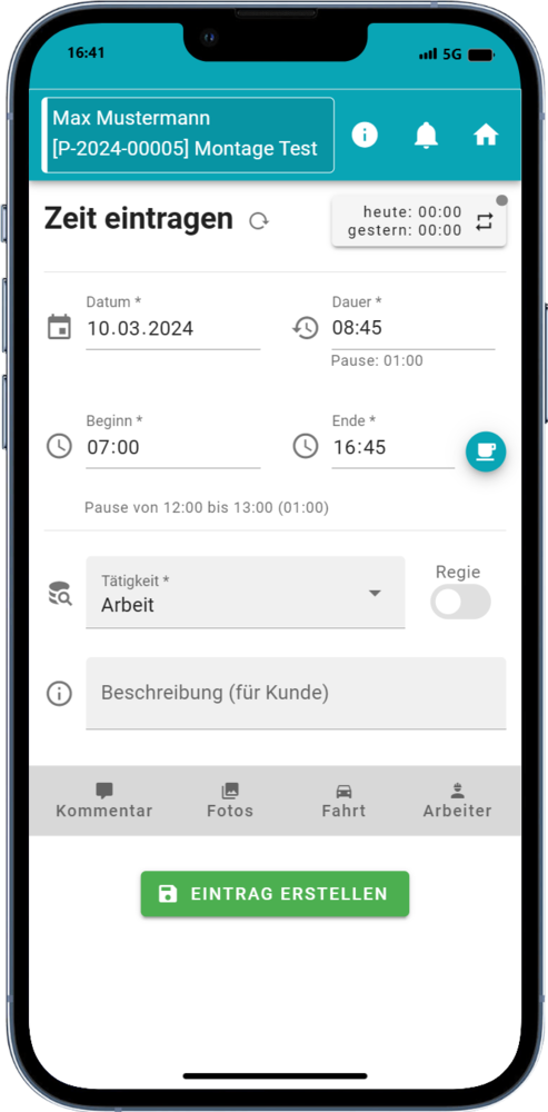 - Eingabe von / bis und automatische Berechnung der Stunden