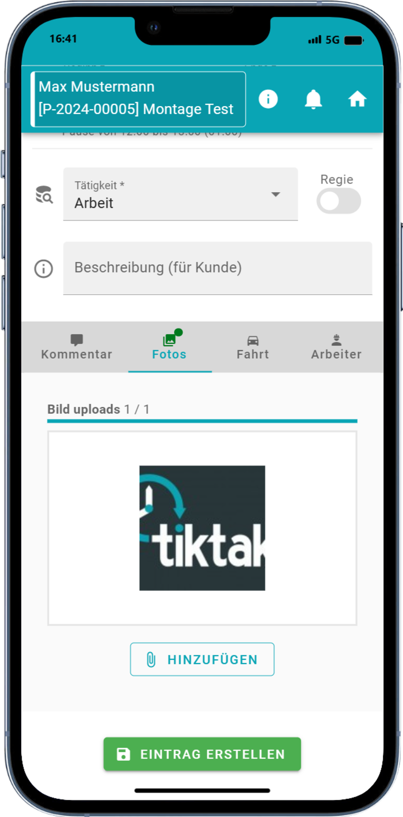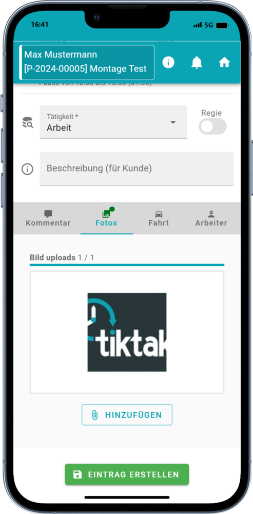 Sie können dem Zeiteintrag direkt Bilder mitgeben, welche im Anschluss mit Kunde, Projekt & Zeiteintrag verlinkt sind – zum individuellen Upload von Bildern sehen Sie sich das Modul Fotos an.